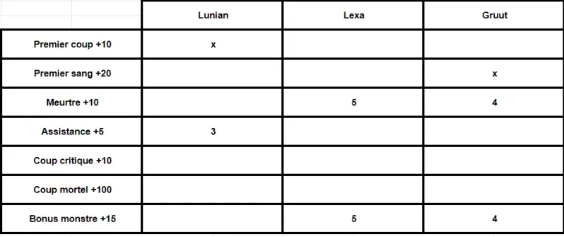 Pour gagner de l'expérience, il faut se battre soit avec des créatures hostiles ou des brigands, etc... mais aussi en effectuant des missions disponible au gîte du lièvre fou. Lors des combats le Maitre du jeu doit faire un barème, conseiller d'ouvrir un google sheet pour faire un tableau comme ci-dessous. Le premier coup correspond à celui qui frappera le premier lors du combat. Le premier sang définie qui tue en premier, si un ennemi obtient le premier sang, personne ne l'aura. Le meurtre est le bonus de kill, l'assistance donne de l'expérience si on participe à un meurtre. Le coup critique est donner si elle est pas esquiver ou contrer. valable que pour les réussites critique. Les coup mortel donne le plus d'expérience, mais correspond à une réussite critique à 20. Le bonus monstre est pour finir, ce qui correspond à l'expérience que donne la créature, et est donner qu'en cas de meurtre, ou d'assistance.